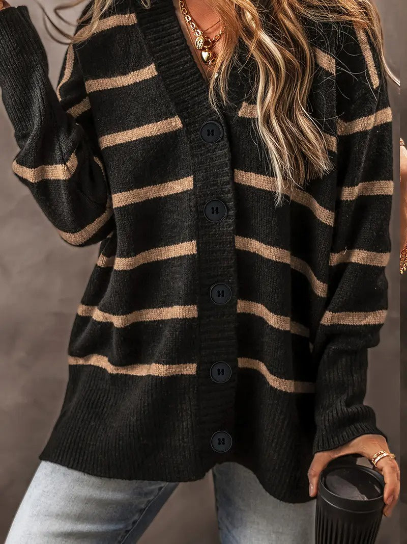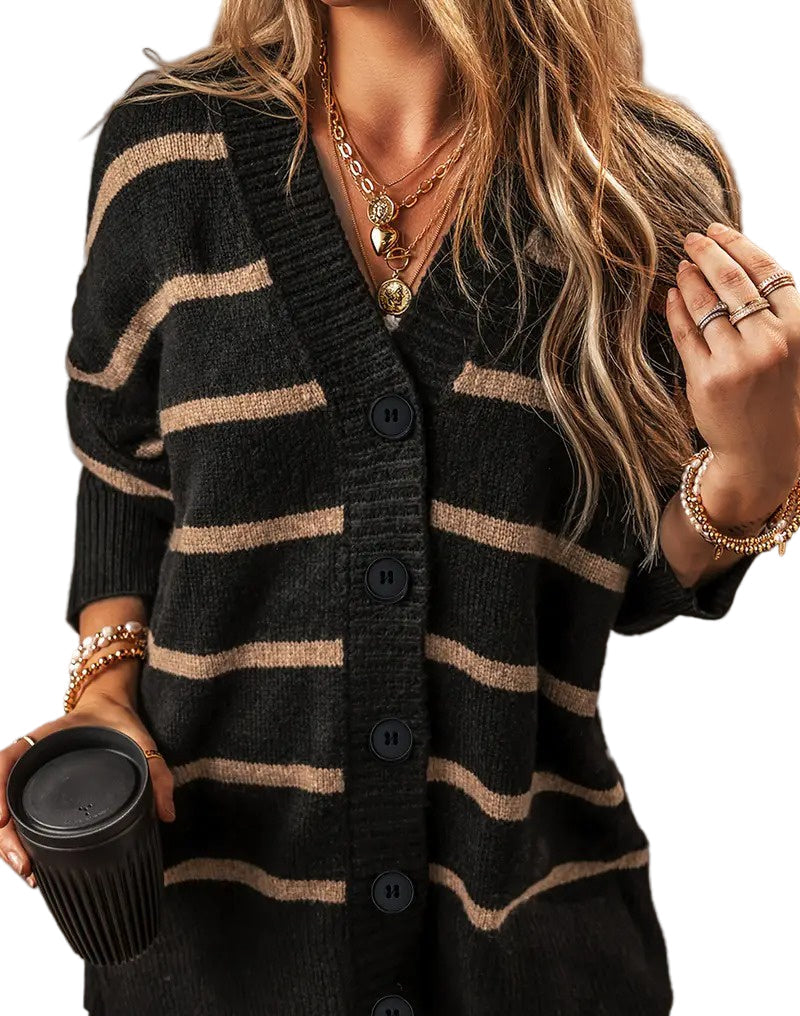 Ten damski kardigan ma dekolt w serek i długie rękawy. Przód swetra zapinany jest na guziki w pełnej długości. Kardigan ma poziome paski na całej powierzchni. Prążkowane obszycie znajduje się na mankietach, dole swetra oraz przy listwie guzikowej.