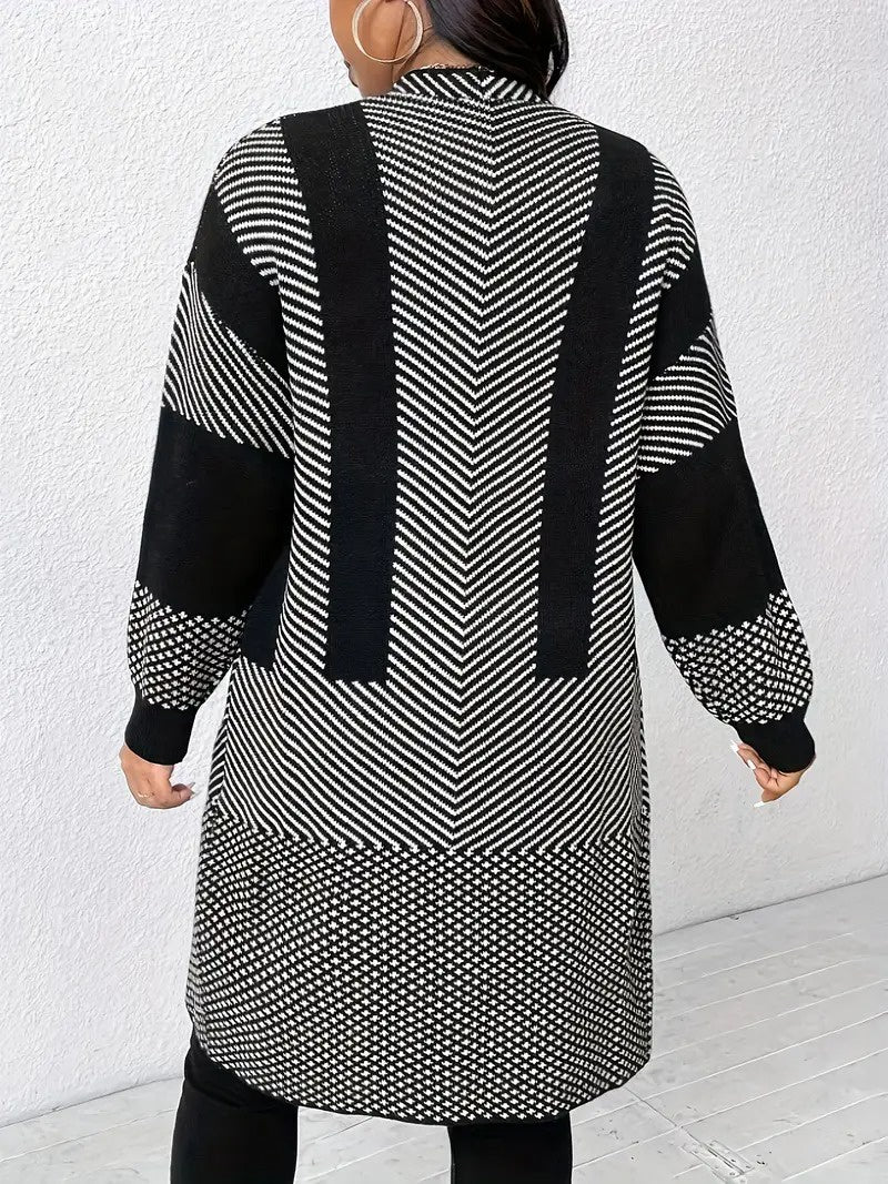 • Styl: Kardigan z otwartym przodem i wzorami geometrycznymi.