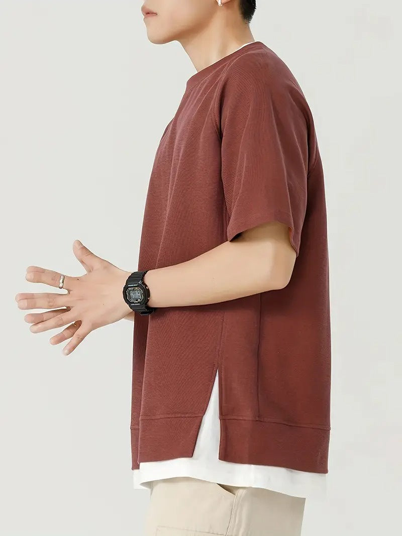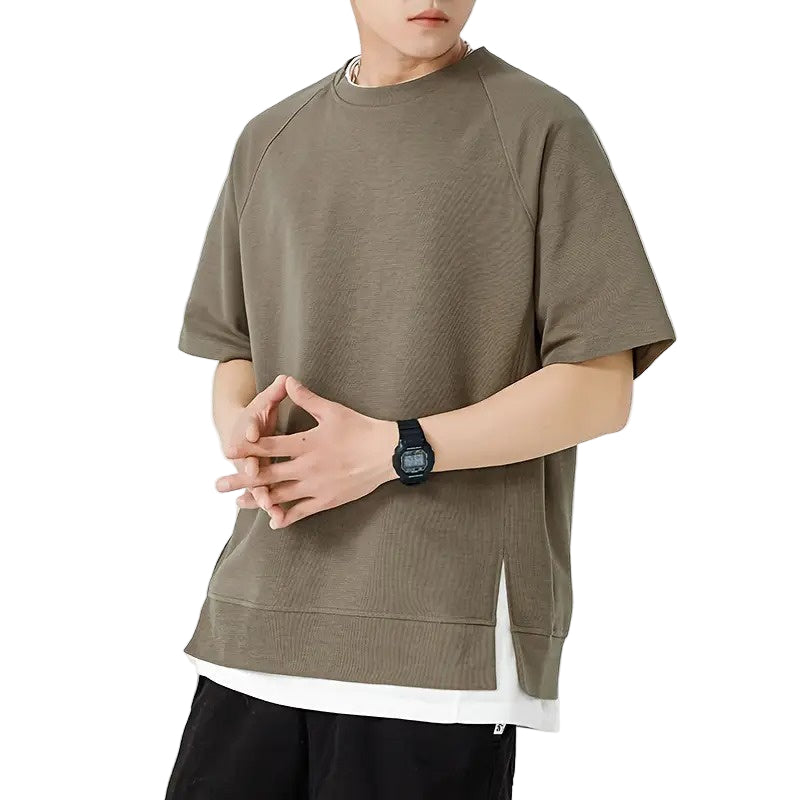 Ta męska koszulka ma okrągły dekolt z przodu. Koszulka ma krótkie rękawy. Po bokach przy dolnym brzegu znajdują się małe rozcięcia. Dolny brzeg wykończony jest szeroką prążkowaną lamówką.