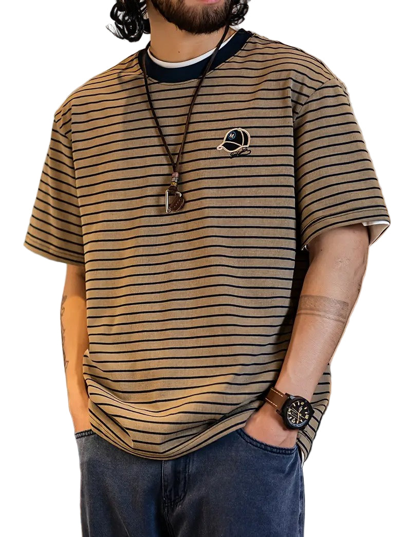 Ta męska koszulka z krótkim rękawem ma okrągły dekolt. Koszulka ma poziome paski rozmieszczone na całej powierzchni. Kołnierz ma kontrastową lamówkę. Na jednej stronie klatki piersiowej znajduje się mały haftowany emblemat.