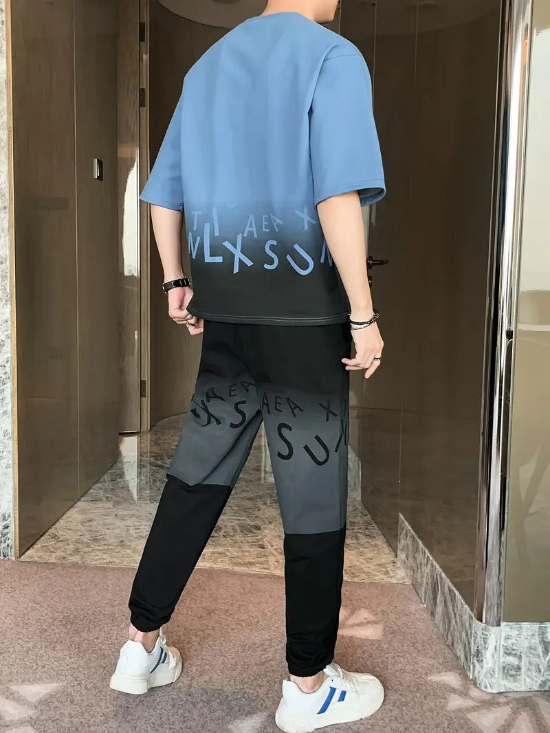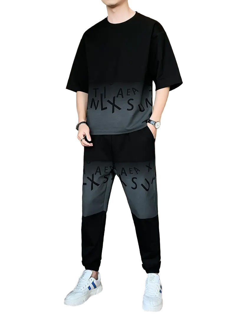 Ten męski zestaw zawiera koszulkę z krótkim rękawem oraz spodnie typu jogger. Koszulka ma okrągły dekolt z przodu. Zarówno koszulka, jak i spodnie mają efekt gradientu. Na dolnej części koszulki oraz w górnej części spodni znajdują się nadrukowane, rozproszone litery.