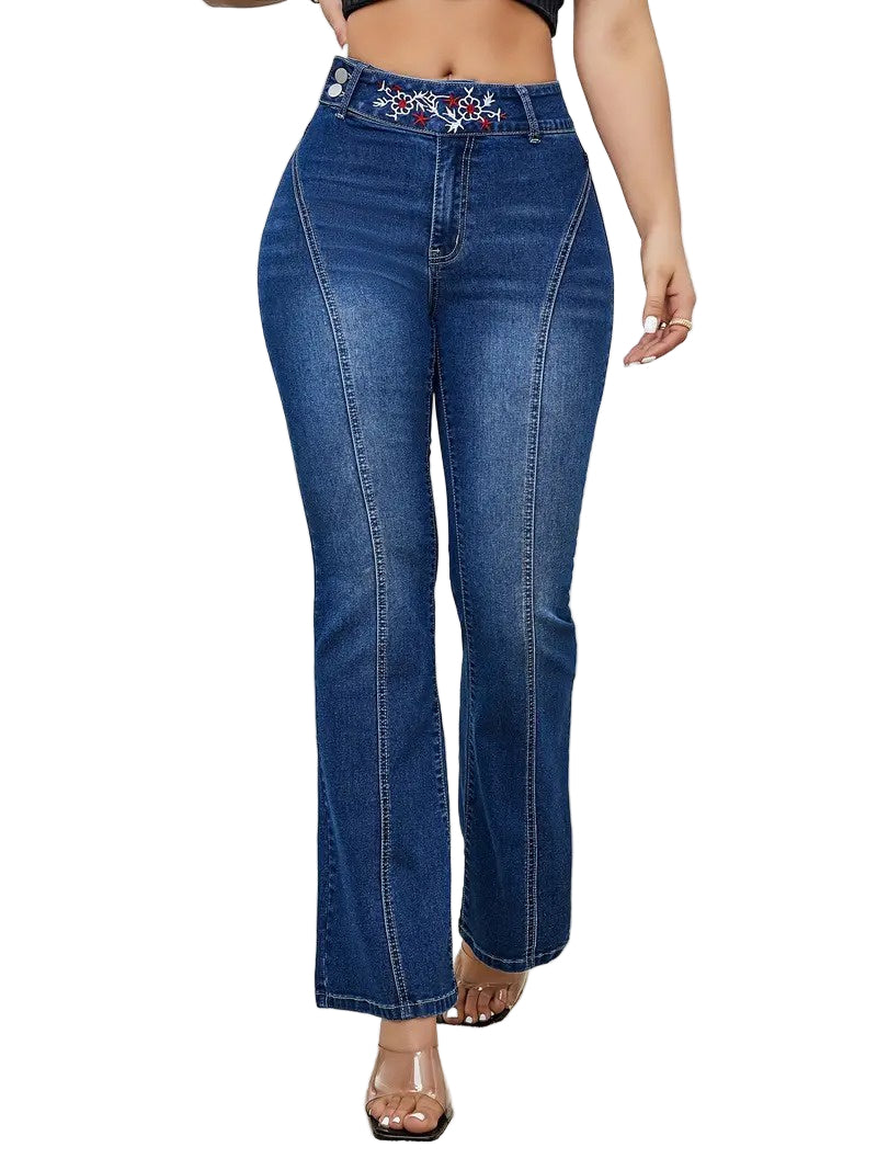Te damskie spodnie mają wysoki stan. Krój jest dopasowany w okolicy bioder i ud, a rozszerza się ku dolnej części nogawki. Spodnie mają pionowe szwy biegnące wzdłuż przednich części. Pasek w talii ma szlufki, dwa przednie guziki oraz kwiatowy haft z przodu.